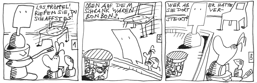 Schrank gelüftet sein. Der Pröppel findet ein Glas mit Bonbons.