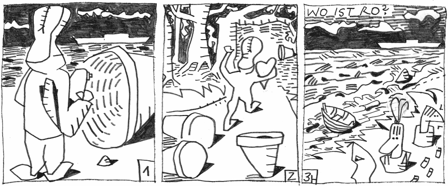 | (17 / 25) Der Herzkissen-Ro ist vollkommen erschöpft und sucht einen Unterschlupf. Plötzlich stutzt er. Vor ihm stehen und liegen eine Anzahl Behälter, in denen einmal Lachkraut gezogen worden war. Tönerne Zellen eines verlassenen Lachkraut-Alkatraz. Ro entscheidet sich für einen Behälter, der ein Stück weiter im Inselinneren auf der Lichtung eines Gehölzes liegt. Mittlerweile sind auch Vulkana und die Kids gelandet und nehmen Ro`s im Sand gut erkennbare Fährte auf. |