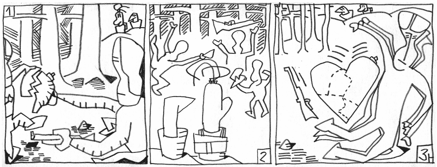 | (23/ 25) In einer Senke jenseits des Hügels kommt es zum Show-down. Nur ein Ro hat noch eine Waffe, die sich nicht als Wasserpistole herausgestellt hatte, und zwingt die anderen ihre Herzstücke dem seinen anzufügen. Die gewaltige Kraft, die die ursprüngliche Herzenseinheit wieder herstellt, springt auch auf die Ros über und presst sie wie ein Kartenspiel zusammen. |