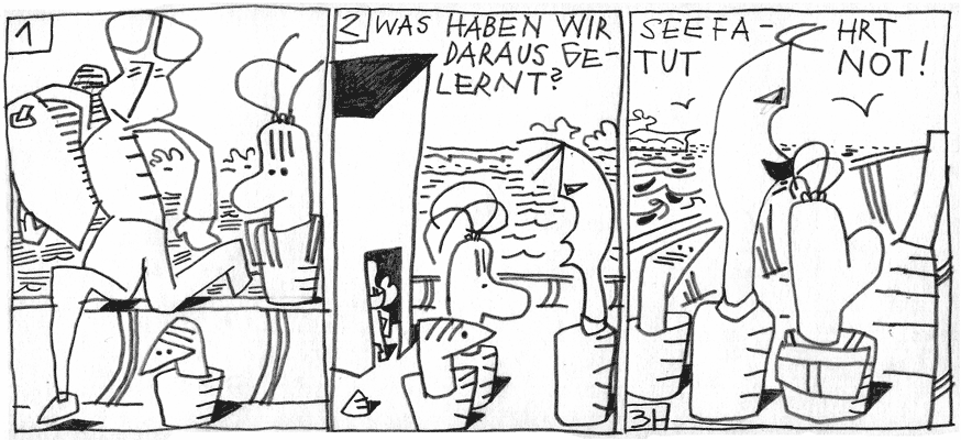 | (25 / 25) Die Begrüssung klingt zuerst nicht besonders freundlich. Nur Ro ist froh. Er muss ja auch keine Hausaufgaben machen oder kontrollieren, ob sie gemacht worden sind. Der Frage, was man aus all dem gelernt hätte, weicht er ins Schiffsinnere aus. Vulkana und die Mädchen bleiben im Freien. Der frische Wind bläst ihnen ins Gesicht. The answer is blowing in the wind. |