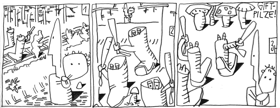 | (12 / 15) Eine ganze Kolonne Staatsstiefel überquerte mit erhobenem Schlagstock die Schienen und stiegen in den gegenüberliegenden Wald hinab. Furchtsam, aber von dem grossen Gefühl erfüllt, dem Ziel ganz nahe zu sein, folgten ihnen Woo-Fi und das Kind. Mit dem Schlachtruf „Giftpilze!“ stürmten die Staatsstiefel voran. |