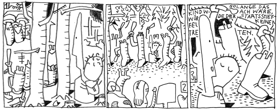 | (13 / 15) Auf der Anhöhe stand das Freundschaftshaus im vollen Sonnenschein. Die Elfs, Pröppels und Givepeaces hatten sich gegenseitig untergehakt und bildeten eine Mauer. Die Staatsstiefel waren ersteinmal stehengeblieben. Wer weiss, was ohne das Kind geschehen wäre? Mit Woo-Fi war es bis in die erste Reihe der Staatsstiefel gekommen wo es von allen gesehen wurde. Jetzt sahen sich die Gegner ebenfalls mit den Augen eines Kindes. Ermüdet von der Hitze schlief Hier-soll-es-schön-sein ein. |