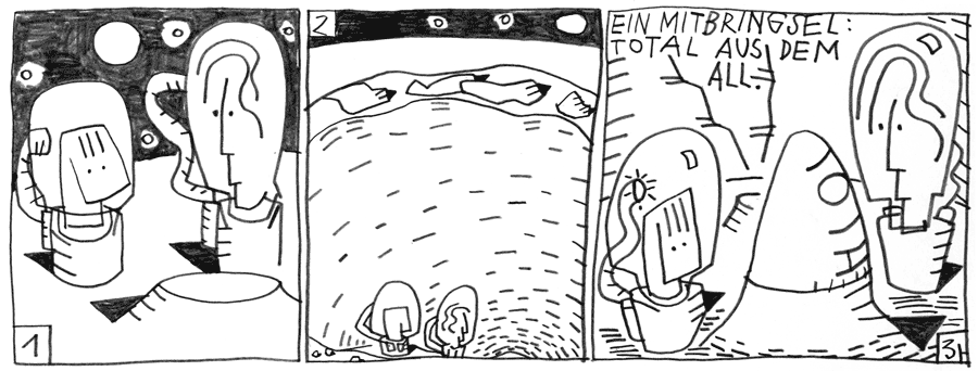 | (9 / 56) Auftrag erledigt. Auf der Suche nach einem Mitbringsel klappern Melo und Hier-soll-es-schön-sein die Krater ab. Aber sind waren leer. Da machen sie eine sensationelle Entdeckung. In einem Krater ist wieder ein Krater. Es ist ein kleiner Krater mit einem Lava-Helm, der eiförmig ist und so groß wie das Kraterchen selber. Er trägt eine Aufschrift. Total, lesen die Kids beim Drumherumgehen. |