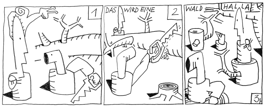 | (16 / 56) Der Wergler freut sich, Woo-Fi, den Vater der Lückenknüller Kids, kennenzulernen. Mit seiner Arbeit ist er fast fertig, aber ein Baum war übriggeblieben. „Was soll das hier überhaupt werden?“ fragt Woo-Fi, als er die Kids auf den Baumstümpfen sieht. „Eine Wald-Halla.“ antwortete der Wergler. Da hatte er eine Idee: „Sie kriegen auch ein Ehrenpodest.“ „Hallo, No-nein, Du auch hier?“ |