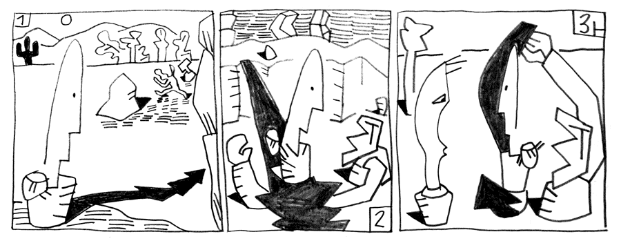 | (25 / 56) So wie Woo-Fi mit Hilfe seines Tannenschattens auf die Felswand hinaufgekommen ist, will auf der anderen Seite wieder hinunter, wo er eine Szene sieht, deren Verstrickungen ihm aufs erste unklar bleiben. Ihm scheint jedoch Eile geboten. Er fällt Bypass in den Arm, den dieser offenbar gegen Vulkana erhebt, und stolpert dabei über den eigenen Schatten. „Vorsicht!“ sagt Bypass, der sich auskennt, „ mit Tannenschatten ist nicht spassen!“ |