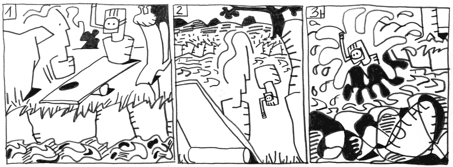 | (33 / 56) Die Kids verlieren keine Zeit. Um ohne Umschweife in die Flussmitte zu gelangen und dabei vielleicht auch an Totals Flugbahn anzuschließen, verwandeln Melo und Hier-soll-es-schön-sein die mitgebrachte Planke in ein Sprungbrett. Unweit von Totals Ruheplatz, der vom Ufer aus nicht zu erkennen ist, durchbricht Melo den Wasserspiegel. |