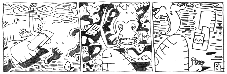 | (35 / 56) Melo und das Oasodil, die sich, um schneller voranzukommen, Melos Schnorchel teilen, finden Totals Fußspuren. Auf den Anblick des Gesuchten allerdings ist das Oasodil nicht gefasst. Vor Schreck verliert es den Schnorchel und sucht angsterfüllt das Weite. Melo gerät in Atemnot. Ohnmächtig wird er zum Spielball der Strömung. Eine dieser Mangelsituationen ist entstanden, die den Perfektionisten Total aus dem Häuschen bringen. |