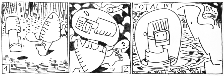 | (36 / 56) Gleich ist Total bei dem Verunglückten. Mit einer Lufthülle behebt er nicht nur Melos akute Atemnot. Total sorgt nach seiner Maßgabe auch insgesamt für eine Formverbesserung des Erdenbewohners. Melo atmet tief durch. In einer Luftblase gelangt er wieder an die Oberfläche und kann jetzt die seit langem im Raum stehende Frage beantworten: Ja, Total ist da! |