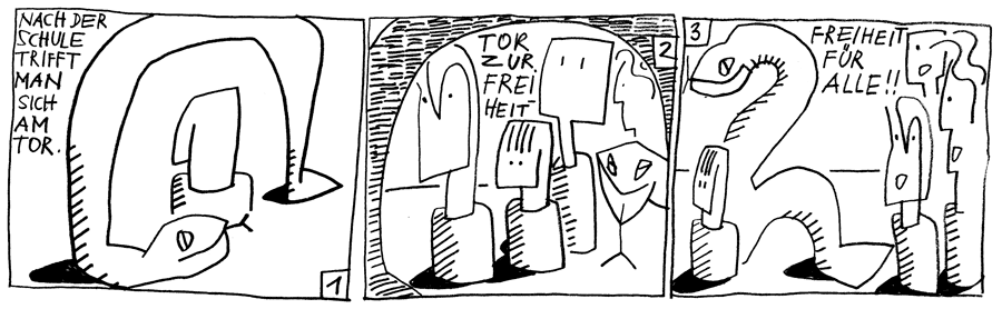 | (7 / 37) Anderentags ist alles fast wieder normal. Wie jeden Mittag treffen sich die Schulkids am Unteren Tor von Everywen, das in die Stadtmitte führt. In ihrem Kreis gibt es eine neue Attraktion. Melo, der völlig unausgeschlafen ist, hat Liberty mitgebracht. Die kluge Schlange schlägt Bögen und krümmt sich zu Toren, durch die hindurch die Kids weiter als bis zur Stadtmitte sehen. Da ist die Freiheit. Wie sieht das die städtische Jugend-Förderung? |
