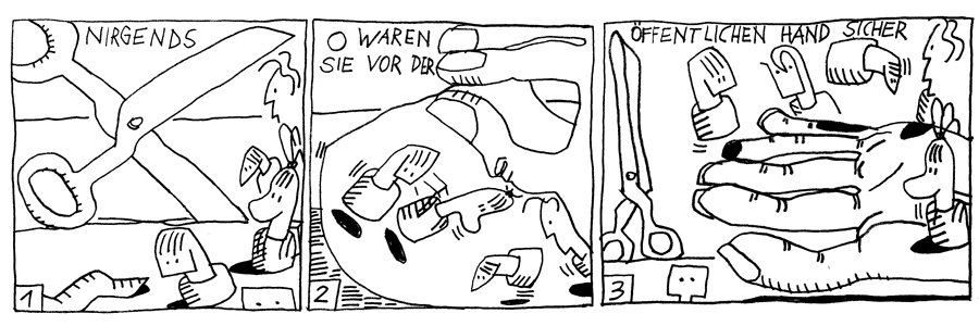 | (8 / 37) Die Freiheit, wie sie Liberty, Melos Schlange versteht, zieht die Kids an wie das Licht die Motten. Im letzten Augenblick aber halten sie inne. Ganz cool! Wer erwischt wird, dem schneidet die Öffentliche Hand mit ihrer Schere ein Stück Lebenszeit ab. Wer brav ist, der darf in ihrer Spring-Burg auf dem Bürgerfest hüpfen. Also, was ist! |