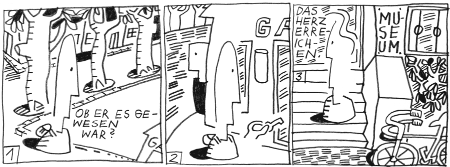 | (10 / 37) Der Gedanke an Hier-soll-es schön sein löst in Woo-Fi etwas aus, das den Alltag unmerklich verändert. Übrigens, nicht vergessen! 18.30 Uhr, Rats-Sitzung! Ebenso ergeht es Woo-Fis großem Sohn, der anders als geplant zum Museum abbiegt. Eigentlich interesssiert er sich wenig für die Große Kunst im Museum und die Freiheit, die sie verspricht. Aber er hat eine Idee. |