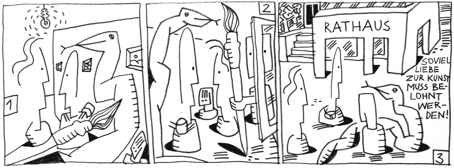 | (13 / 37) Da schneit Hier-soll-es-schön-sein herein. Der Pröppel hält ihn für einen Künstler. Zeigen Sie mal her! Das Mitbringsel erntet von allen Seiten Bewunderung. Der Pröppel hält es für ein Meisterwerk, das ihm jeden Preis wert wäre. Die Provision, die für Woo-Fi abfällt, ist ansehlich. Dankbar verspricht er, die Frage der Jugend-Förderung in den Stadtrat zu bringen. Ihr müsst mir aber Euere kleinen Daumen drücken! |