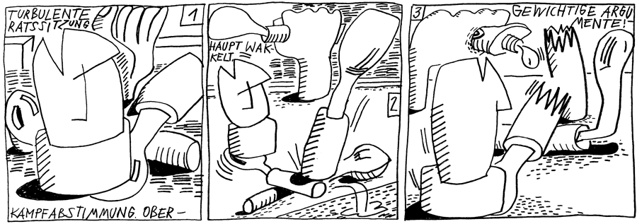 | (17 / 37) Es gibt tumultartige Szenen, einzelne Löffler geraten aufs Heftigste aneinander, was zu irreparablen Stilbrüchen führt. Der Ober schlägt einen Kompromiß vor, dem Vorschlag des Stadtratskollegen Woo-Fi zu folgen und die Entscheidung von einem Ortstermin abhängig zu machen. Einstimmig. Die Angelegenheit wird dem Finanzausschuß übertragen, der seine nächste Sitzung im Schätzlerbad abhalten wird. |