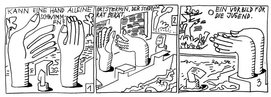 | (18 / 37) Ortstermin im Schätzlerbad. Die Finanzierung der Jugendförderung steht auf der Tagesordnung. Es werden auch Kids unter den Zuschauern registriert, die mehrheitlich sehen wollen, wie eine Hand die andere wäscht. Doch die Sensation ist eine andere. Nach längerem Händeringen trägt der Finanzausschuß der Öffentlichen Hand auf, gemeinsam mit der Rechten Hand des Oberhauptes ein Geldschwimmen durchzuführen. |