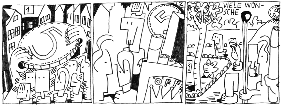 | (21 / 37) Welche Möglichkeiten eröffnen sich da! Im Triumpfzug tragen die Kids ihren Schatz durch die Stadt. Wem verdanken wir das? Ihrer Jugend! Laßt uns diesen Reichtum bewahren! Unterwegs besorgen sich die Kids Luftschloß-Palisaden und Schlagzeug-Sticks. Damit bauen sie die angestammten Orte ewiger Jugend in Everywen zu Festungen gegen das Altern und die Ältern aus. Zuerst den Wood-Stock, einen Hügel im Stadtpark, wo man alljährlich der Befreiung vom Schulzwang gedenkt. |