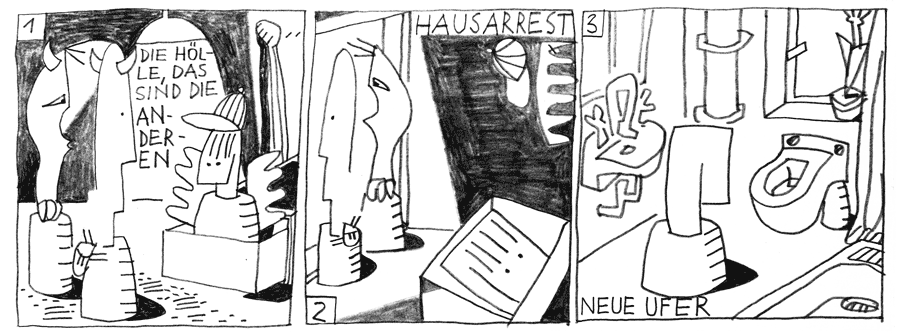 | (33 / 37) Vulkana und Woo-Fi, die wegen Melo große Sorgen gehabt hatten, verordnen für den nächsten Tag Hausarrest. Melo schläft wie ein Engel. Als er aufwacht, schlafen alle anderen noch. Es ist ganz früh am Morgen. Das Badezimmer umfängt ihn mit der Frische des ersten Schöpfungstages. Es werde Licht. Melo tritt ans Fenster. |