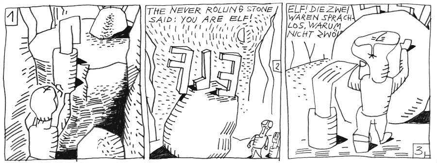 | (5 / 10) Woher wußte Woo-Fi diesen Namen und seine Bedeutung? War er selber schon einmal dort im Gebirge gewesen, wo Melo und der Elf gerade hinaufsteigen? Melo und der Elf kommen in großer Höhe ans Ende der Schlucht. Sie helfen sich gegenseitig über hohe Felsschwellen. Schließlich stehen sie vor dem Ursprung allen Gerölls, dem Never-Rolling-Stone. Der Stein lobt sie. Was er aber sagt, bleibt für Melo und den Elf unverständlich. |