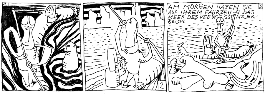 | (9 / 10) Die Antwort auf Melos Fragen liegt im Meer des Vergessens, dessen Zufluß sie im Morgengrauen erreichen. Auf dem Rücken der Wurst schwimmen sie der aufgehenden Sonne entgegen. Die Fahrt führt an prähistorischen Stätten vorüber. Am Meeresrand entdecken sie die bleichen Reste uralten Vergessens. Sie liegen vor einer schwarzen Höhle. |