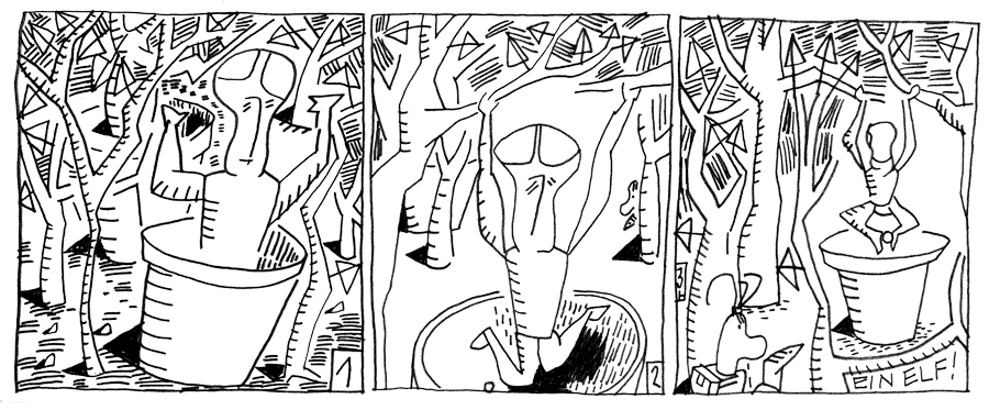 | (7 / 11) Als der Elf wieder aufwacht, befindet er sich in einem Wald, der die bisherige Lichtung ausfüllt. Er zieht sich an zwei Zweigen empor. Den Kids war die Zeit nicht lang geworde, und nun taucht ihr erster Elf auch schon wieder munter und ausgeschlafen auf. Er zieht sich an den neuen Zweigen empor. Als er seine Beine nachzieht, erkennen die Kids zwischen seinen Füssen eine Kugel, die wie Kaugummi zu haften scheint, sich überraschenderweise aber auch rollen lässt. |