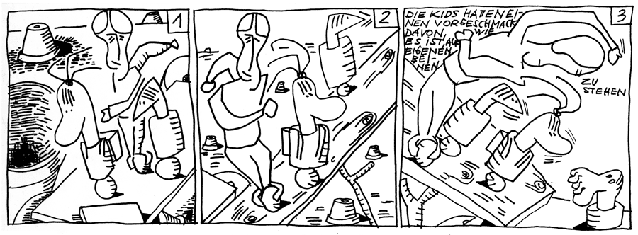 | (9 / 11) Die drei verstehen sich gleich. Wie ist das, wenn man auf eigenen Beinen steht?, wollen die Kids wissen. Der Elf fordert sie auf, mit ihm Fuß-Ball zu spielen. So würden sie das am schnellsten herausbekommen. Und schon erreichen sie in hoher Geschwindigkeit eine fremde Gegend. Auf einem abschüssigen Holzweg gelangen sie zu einem Platz, wo sie von einem Kopf-Füssler begrüßt werden. |
