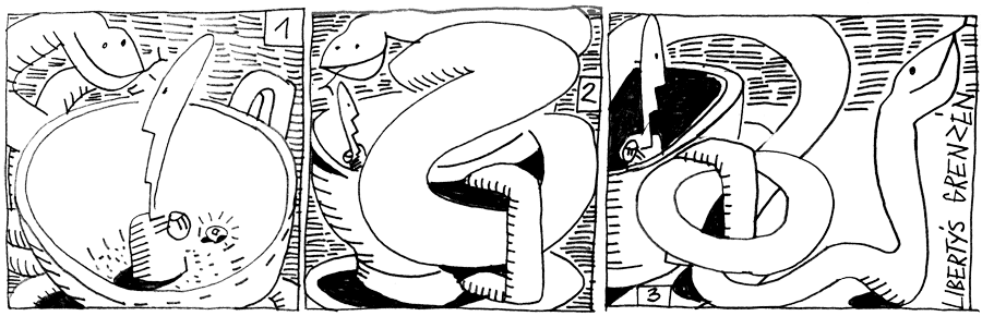 | (10 / 34) Libertys Anwesenheit verstößt gegen die Hausordnung. Eigentlich müsste Woo-Fi schimpfen oder die Polizei holen. Immerhin ist er ein leitender Leerer und damit für die Ordnung im Amt verantwortlich. Aber dafür müsste er erst einmal aus seiner Gefangenschaft heraus. Das aber geht nur mit Liberty Hilfe. Liberty allerdings möchte sich noch ein bißchen umsehen. Schade, daß es keinen Kaffee gibt! |