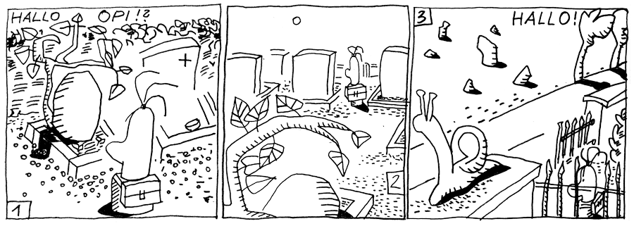 kennt. Sie geht zwischen den Grabsteinen voran. Auf Opis Grab liegt ein