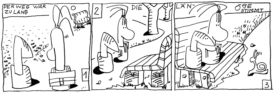 | (17 / 34) Die Mädchen sind jetzt im Stadtpark. Es ist nicht mehr weit bis zur Schule. Aber der Weg wird immer länger. Tempo, die Schnecke, ist schon nicht mehr zu sehen. Die Kids halten Ausschau nach einem kürzeren Weg. Die Park-Bank hat im Augenblick genau die richtige Länge. |