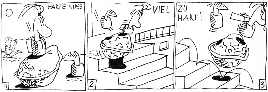 | (24 / 34) Diese Nuß macht den Mädchen viel Kopfzerbrechen. Sie geht nicht auf, während der Streit zwischen dem Physik-Elf und dem Mhki vollends eskaliert. Die beiden jagen sich durch das Haus. Wie hat das alles angefangen? Was hatten wir in der letzten Stunden durchgenommen. Melo weiß nicht, was er machen soll und läuft einfach mit. Die Mädchen bringen die Nuß an die Treppe und führen ein physikalisches Experiment durch. Klacker di Klacker die Klack! |