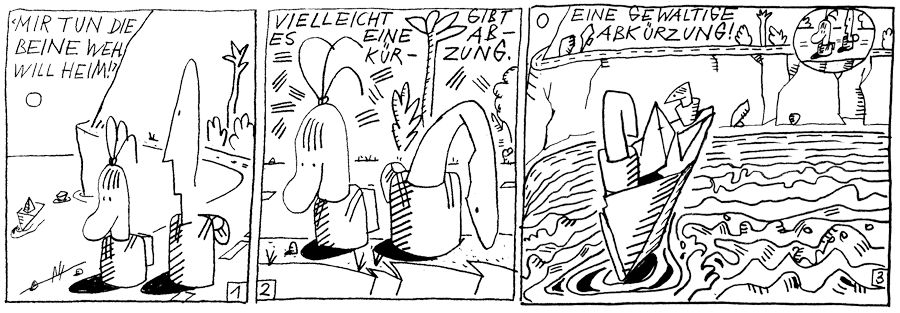 | (32 / 34) Melos Boot nimmt unbeschadet Fahrt auf. Auch Woo-Fi und Hier-wohne-ich kommen ungeschoren davon. Aber Hier-wohne-ich tun die Füsse weh. Die beiden müssen den ganzen Weg wieder zurück. Gibt es nicht vielleicht doch eine Abkürzung? Da unten schwimmt sie. Nur nicht den Mut sinken lassen! Vielleicht können wir mit dem Zwillingsboot fahren. Aber wenn das einem Mhki gehört, müssen wir mit ihm Schiffe-Versenken spielen, befürchtet Hier-wohne-ich. |