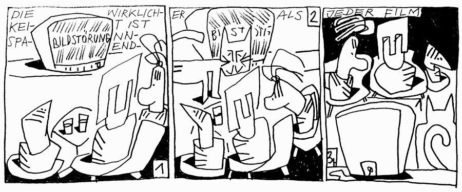 | (10 / 32) Als die Spannung ihren Höhepunkt erreicht, gibt es eine Bildstörung. Von draußen kommt Minza. Das Bild von einer Katze. Aber Groß-E und die Mädchen sehen weiterhin voller Erwartung auf den flimmernden Bildschirm. Wie mag Hier-soll-es-schön-sein abgeschnitten haben. |