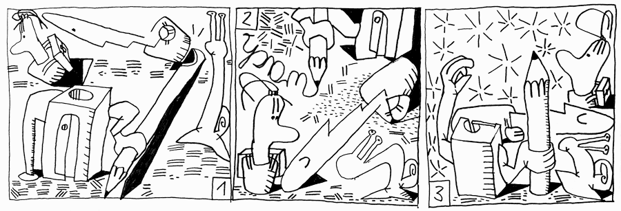 blickender Spitzer hinter sich herzieht. Wer hatte hier Vorfahrt gehabt? Woo-Fi stürzt, schlägt sich den Kopf an, ist ohnmächtig. Damit wärst Du durch die Klingen-Schein-Prüfung gefallen, lieber Spitzer! Trotz seiner Entschuldigungen ist Woo-Fi nicht mehr wachzukriegen. Die Lebens-Strom-Leitung ist leck, Lebensfunken springen in die Außenwelt. Die Kommas von Woo-Fis Lebensgeschichte schließen sich zu strahlenden Sternen zusammen. Zeitlosigkeit entsteht. |