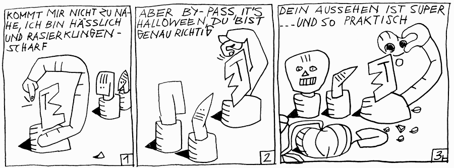 | (17 / 32) Was für eine traurige Gestalt! Bypass sträubt sich noch, Melo und No-Nein näher an sich heranzulassen. Aber schließlich fühlt er sich geschmeichelt. Wir nehmen Dich, so wie Du bist. Er schneidet für die Kids aus den Kürbisen Halloween-Masken. |