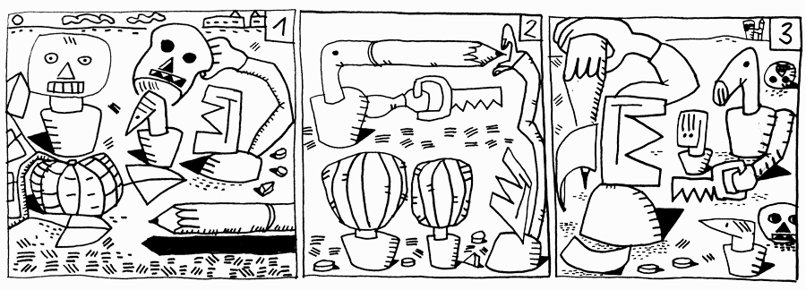 | (18 / 32) Als No-neins Maske fertig wird, betritt der Wergler den Schauplatz. Er zeigt stolz seine neue Säge. Er hat seinen Zimmermans-Bleistift bei sich. Für Bypass ist das die größte Verlockung. Darf ich? Der Wergler gestattet By-Pass, den Bleistift zu spitzen. Das hatte der Spitzer befürchtet. Ein klarer Verstoß gegen Recht und Ordnung. Von Frieden kann erstmal keine Rede sein. |