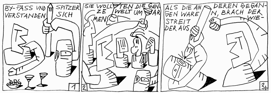 | (23 / 32) Die alten Gegner verstehen sich bestens. Es wird lange gefeiert, schließlich brechen die Kids auf. Die Mädchen wollen zu Gross-E, die Jungen zu Woo-Fi und Vulkana. Als Spitzer und By-Pass alleine sind genügt ein Wort. Schon sind sie wieder in den alten mörderischen Streit verwickelt. |