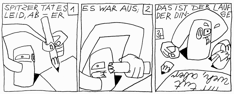 Mit Dir will ich nichts mehr zu tun haben. Er muß öfters spitzen.Hoffentlich wird er mit dem Schreiben fertig, bevor der Stift zuende ist.