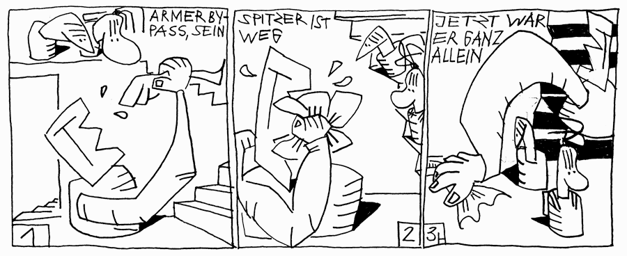 Ein schluchzender By-Pass steigt die Treppe hoch. Blind vor Tränen sieht er die Kids nicht, wie könnten die ihm helfen! Ihm kann Niemand mehr helfen! Er hat allen Schneid verloren.