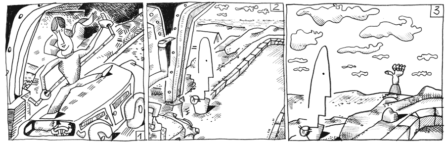 | (20 / 92) Der Sprung war mit schlafwandlerischer Sicherheit berechnet. Als Wies, der Assistent des Architekten, unter dem Brückenbogen durchfährt, landet Mies auf dem Wagendach und führt sogleich Fahrtwindmessungen durch. Woo-Fi setzt in der Gewißheit, die interessante Bekanntschaft mit dem alten Seebären Walter gleich wieder auffrischen zu können, seinen Weg fort. Da erstarrt er. Sollte das ein Fasst-Fussler sein? Vorsicht! Denen sagt man nach, dass sie unberechenbar sind. |