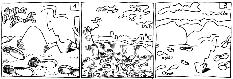 | (26 / 92) Mittlerweile durchquert Hier-soll-es-schön-sein auf der Planeten-Tagseite die Wüste in Richtung Hafen. Hier wird es langsam Abend. Ich brauche ein Boot, um wieder auf die Nachtseite zu kommen. Er folgt den Spuren der Staatsstiefel. Als er hinter einer Düne in eine Senke hinabsteigt, sieht er, daß sich die Spuren aus dem Nichts verdoppelt haben. Dabei besteht die eine Hälfte aus den Stiefelabdrücken und die andere Hälfte aus barfüssigen Abdrücken. |