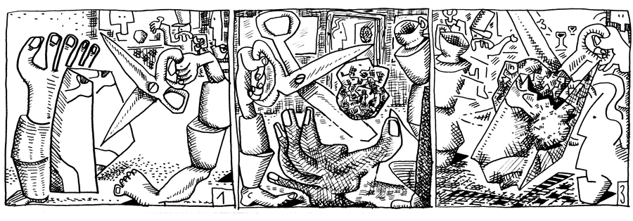 drücken sich in den Hintergrund, um nicht getroffen zu werden. Nur Lehmget Walter bleibt dicht am Geschehen. Hier-soll-es-schön-sein, der Kapitan Walter sucht, entdeckt den Gesuchten durch das Fenster und betritt nichtsahnend das Lokal. Das Papier wirft sich vor ihn und wickelt den Stein ein. Was ist hier los, denkt sich Hier-soll-es-schön-sein und beschließt vorsichtig zu sein. |