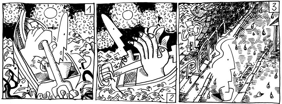 | (35 / 92) Woo-Fi rudert mit aller Kraft durch die wildbewegte See. Lehmgets Boot ist längst schon hinter den hohen Wellen verschwunden. Lehmget wartet am Kai. Hier-soll-es-schön-sein nähert sich dem Hauptquartier der Staatsstiefel. Es beginnt zu regnen. Aus dem Gebäude-Inneren dringen wirre Laute an sein Ohr. |