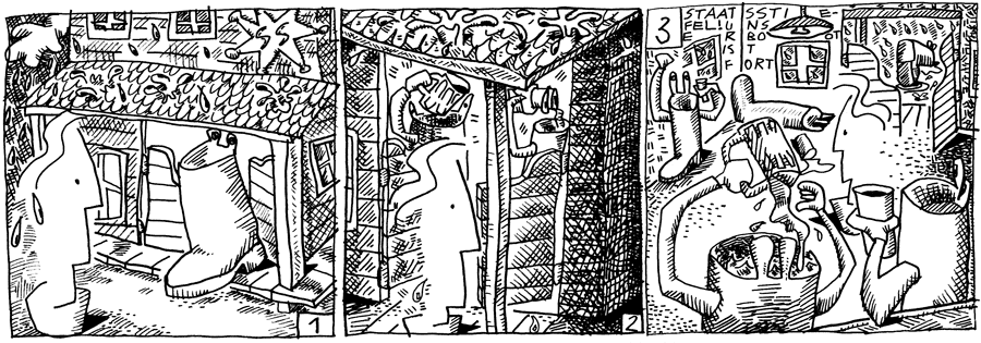 | (36 / 92) Ein Staatstiefel tritt dem Jungen entgegen. Ich habe eine Verlustmeldung zu machen, will Hier-soll-es-schön-sein sagen. Aber der Stiefel zeigt keine Reaktion und verschwindet in der Nacht. Der Junge tritt durch die Schwingtüre. Darauf war er nicht vorbereitet. Soweit das Auge reicht, Staatstiefel, die sich volllaufen lassen. Was war geschehen? Hier-soll-es-schön-sein denkt an die rätselhaften Spuren in der Wüste. Ihm geht ein Licht auf. |