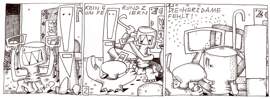 (12 / 281) Vielbier ist begeistert: „Ein neues Kunstwerk an der Wand, das ist ein Grund zu feiern und eine Vernissage zu veranstalten!“ ruft er. Und schon hebt er seine Flaschen-Öffner-Pranken. Der Reli weiß nicht, wie ihm geschieht. Viel lieber wäre er für sich geblieben und hätte die Kunst alleine genossen. Doch er traut sich nicht, die ungeladenen Gäste wieder auszuladen. Außerdem hat das Kind- im- Manne in einem nicht ganz unrecht. Wenn Dakma sagt, daß in Relis Bilder-Sammlung die Herzdame fehlt, rührt das an eine offene Wunde. Die Herzdame wird er nie bekommen. Und jedes neue Bild macht ihm diese Lücke nur noch schmerzlicher bewußt. Wirklich kein Anlass zum Feiern!Vielbier lässt die Hände sinken. Reli hat ein schlechtes Gewissen, weil er seinen Gästen nur eine unvollständige Sammlung zeigen kann.