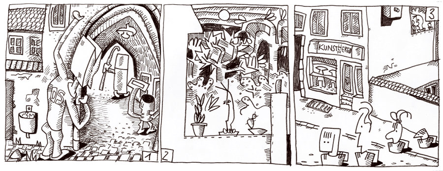 sich die Drei. Die Gaststätte im Durchgang hat schon geöffnet.