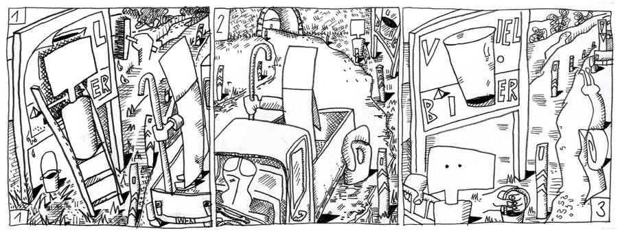 (17 / 281) Die Fahrt führt aufs Land. Am Strassenrand klebt ein Pröppel ein Plakat auf eine Werbetafel. Es ist eine Bier-Reklame, ein erfrischender Anblick, von dem sich der Reli nicht mehr losreißen kann.