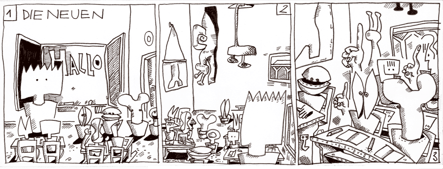 (18 / 281) Wen wir vorhin unter den Kinder vor dem dem Schulportal nicht gesehen haben, waren die Neuen. Der Lehr-Pröppel der ersten Stunde stellt sie uns vor. Es ist aber ein solches Gemurmel in der Klasse, daß die Namen nur schlecht zu hören sind. Es klingt wie No, Xe, By und Fo. Das kann sich doch keiner merken! Willkommen im Al -Kreuch-Gymnasium, rufen alle und machen noch mehr Lärm. Die Neuen gehen auf ihre Plätze. Die Stunde beginnt. Der Lehr-Pröppel hat die Klasse im Griff. |