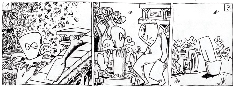 (23 / 281) Gerade will Jan van der Aimer vom Gipfel des Glücks wieder herabkommen, da bleibt sein Blick an einem Gegenstand hängen, der nicht ins Bild passt. Ein Paddel. Auf der Dach-Becken-Brüstung liegt ein Paddel. Unten wieder angekommen gibt er seine Beobachtung an den Strär weiter. Der Strär ist aufgeweckt und hat für alles ein offenes Ohr. Diese Sache weckt sein Interesse außerordentlich. Was macht ein Paddel auf dem Dach? Wer hat es dort liegengelassen? Gute Fragen. Von diesem Paddel zu wissen scheint für`s erste nutzlos zu sein. Aber nicht für den Strär. Offen Fragen haben ihn schon immer gefesselt. „He, was haben die denn für Geheimnisse?“ denkt Melo und fühlt sich den beiden sehr verwandt. |