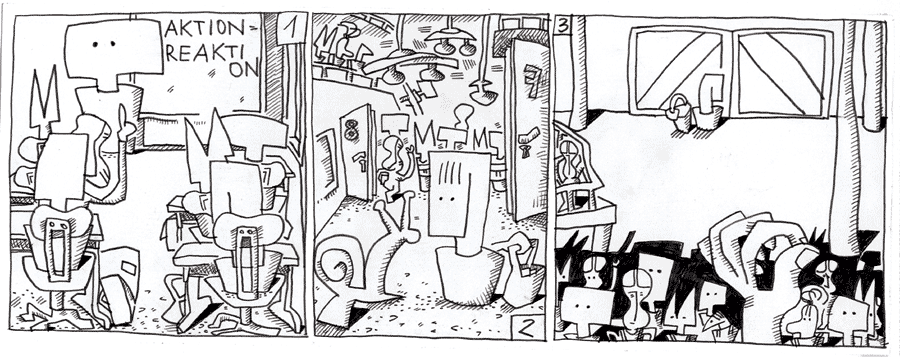 (24 / 281) Die Physik-Stunde geht zuende. Es ist für heute auch die letzte Unterrichtsstunde. Die Schulkinder können endlich nach Hause. Alles verlorene Zeit. Melo träumt. Jetzt wird er hellwach. Was steht an der Tafel? Melo, der nicht aufgepasst hat, fühlt sich für all die verlorene Zeit entschädigt. „Actio = Reactio“ zitiert der Lehr-Pröppel den großen Physiker Isaac Newton. Melo hat es schon immer gewusst. Wie schön, mit seiner Meinung in bester Gesellschaft zu sein. Seine Abneigung gegen die Schule entspricht einem Naturgesetzt, das sogar diese Schule nicht totschweigen kann. Das Glocken-Zeichen! Alle laufen zum Ausgang. Jetzt will`s Melo wissen, will wissen, weshalb Niemand in die Gegen - Richtung läuft. Eine unsichtbare Kraft schiebt ihn gegen den Strom. Die Linke Hand, von derem Tun die Rechte nichts weiß, steht im Gedränge. Als sie sich zufälligerweise umdreht, entdeckt sie Melo vor dem Hinterausgang. Dieser Typ, der sich gegen den Strom bewegt, interessiert die Linke Hand. |