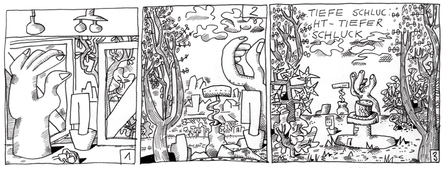 (25 / 281) Melo hatte sich beinah zu einsam gefühlt! Er ist froh, eine Begleitung bekommen zu haben. Die Linke Hand scheint abenteuerlustig zu sein. Voller Tatendrang betreten die beiden Neuland. Vor dem Haus wächst Buschwerk. Einige Bäume ragen hoch in die Höhe. Unvermittelt bricht vor ihnen der Boden ab. Unter sich erkennen sie den Omnibus-Bahnhof. Gleich rechts daneben muß das Rathaus von Everywen liegen. Seine Treppen und der Fahrstuhl verbinden die Klippen-Oberkante mit dem Talboden auf dem kürzesten Weg. Unmittelbar vor den beiden Jugendlichen ragt das Kreuz auf der Kork-Klippe in die Höhe, ein Wahrzeichen von Everywen, das sie bisher immer nur aus der Ferne sahen. Hier kommt man nicht hinunter! Außer mit Flügeln! Aber die haben sie nicht. O la la! Was ragt da aus der Erde auf? Mit frischem Tatendrang treten sie näher. |