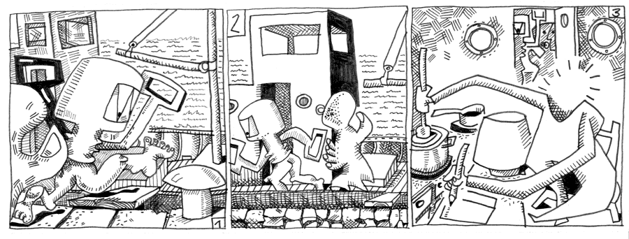 (27 / 281) So kriegen wir heraus, wo Vielbier und Dakma wohnen. Im Hafen also! Das ist doch Lehmgeht Walthers Boot! Dort wohnen sie vorübergehend, solange der Käpitän Landurlaub macht. Ob sie`s noch schaffen? Schneller Dakma! Wieder zu spät! Der Strär ist den beiden in allem voraus. Wie er das macht, bleibt ein Rätsel. Da darf man nicht meckern, daß es wieder Spagetti gibt! Der Musterknabe hat den Tisch gedeckt. Während er kocht, erledigt er gleichzeitig seine Hausaufgaben. Auch er hat etwas Gewinnbringendes aus dem heutigen Physik-Unterricht mitgenommen. Strömungslehre. |