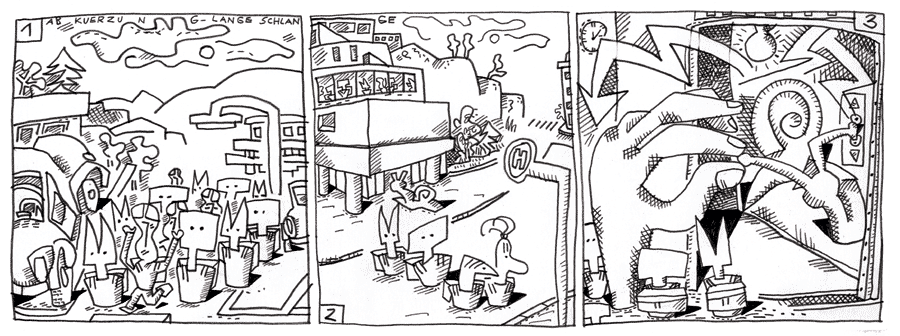 (32 / 281) Na endlich! Jetzt kommt das Bild, das vollends klärt, weshalb man im Rathaus so erregt diskutiert. Die Abkürzung hat sich herumgesprochen, das Rathaus ist im Bewußtsein der Everywener Jugend zu einer Top-Adresse geworden. Das freut, doch die Warteschlangen am Lift nehmen mittlerweile eine beängstigende Länge an. Der Verwaltungsbetrieb im Rathaus ist streckenweise lahm gelegt. Tempo, die Zeitschnecke, hat sich als Lift-Page in der Fahrstuhlkabine einquartiert und hat für nichts anderes mehr Zeit. Da reißt der Öffentlichen Hand der Geduldsfaden. Bei dem ungeplanten Versuch, Tempo Beine zu machen, gibt es einen Kurzschluß. |